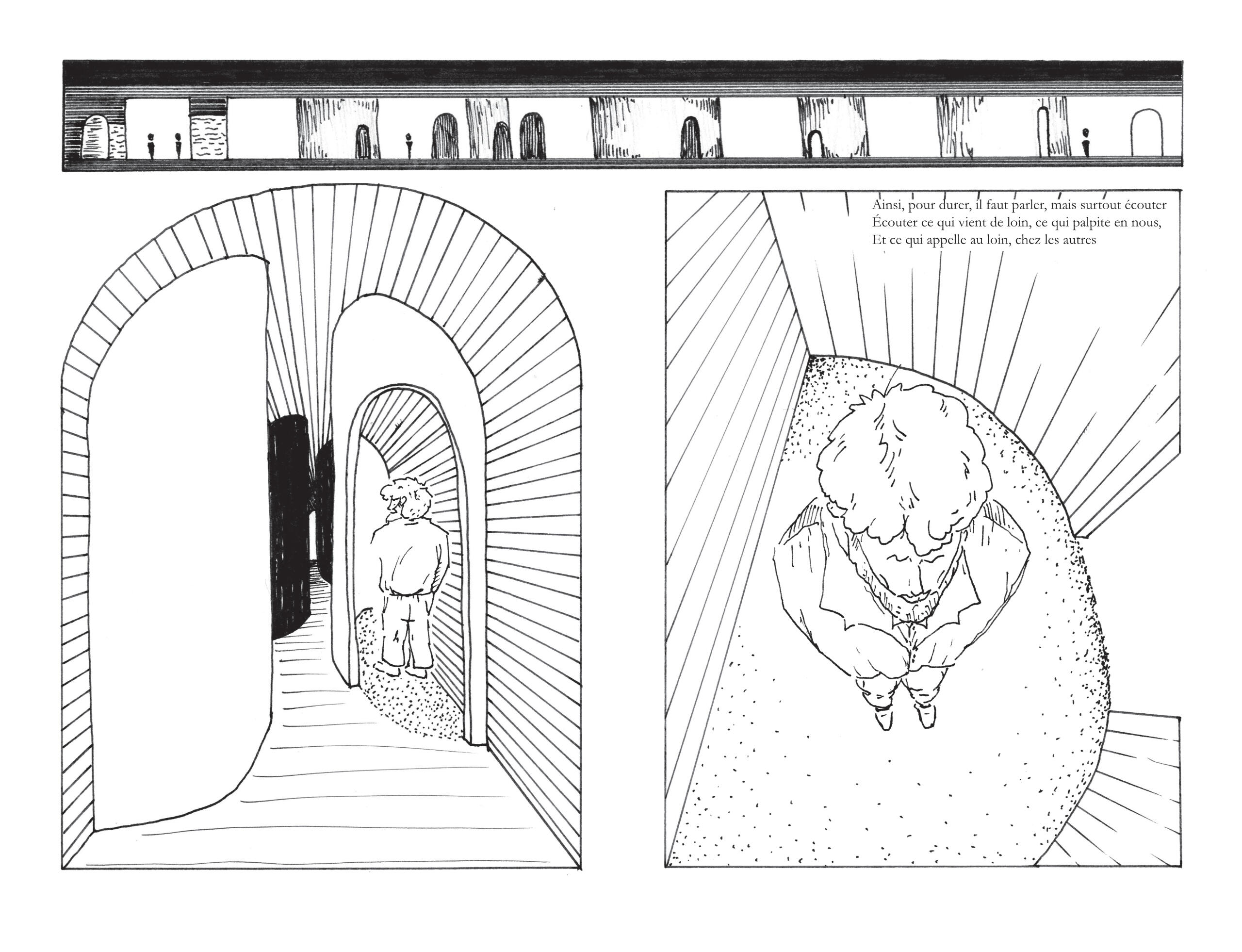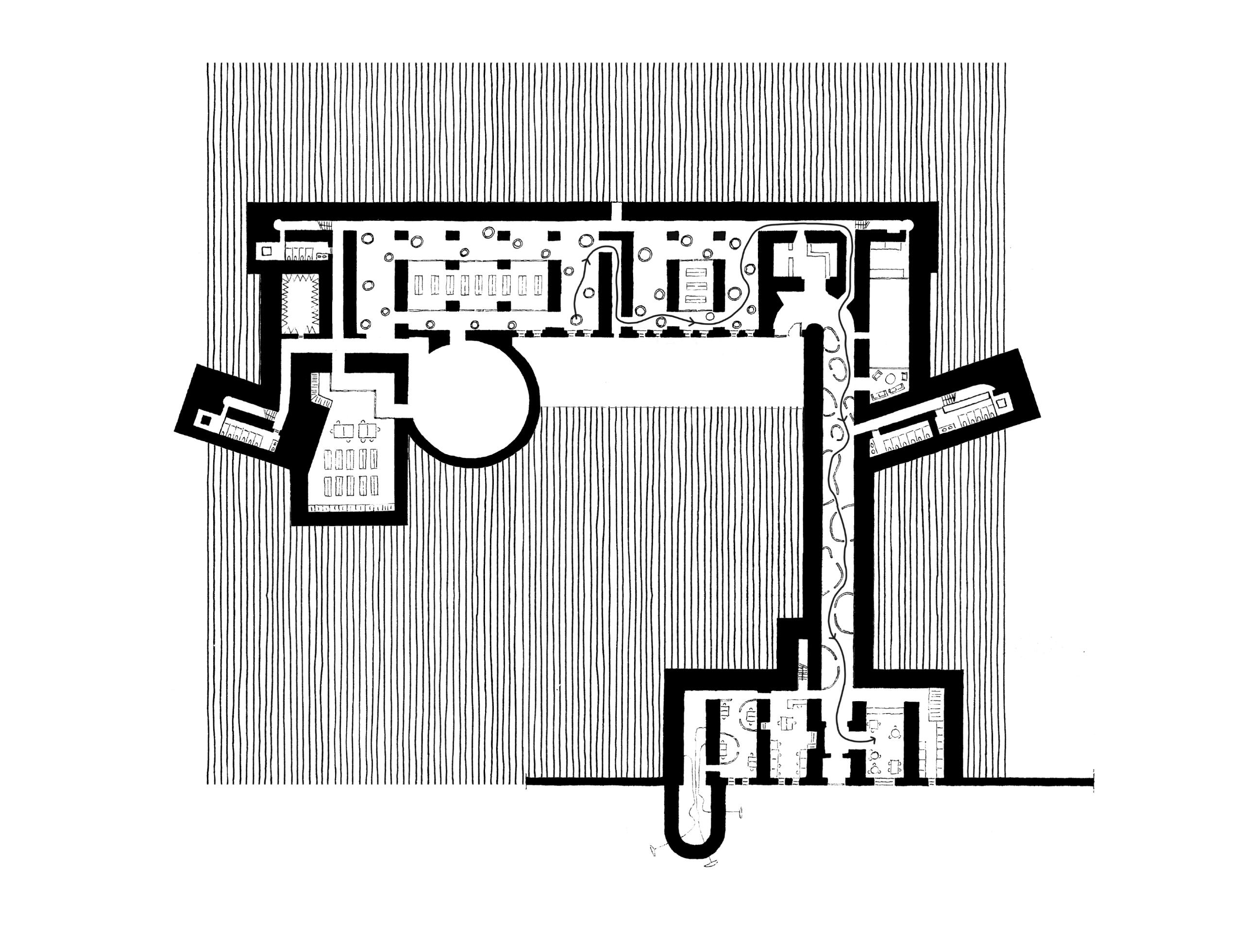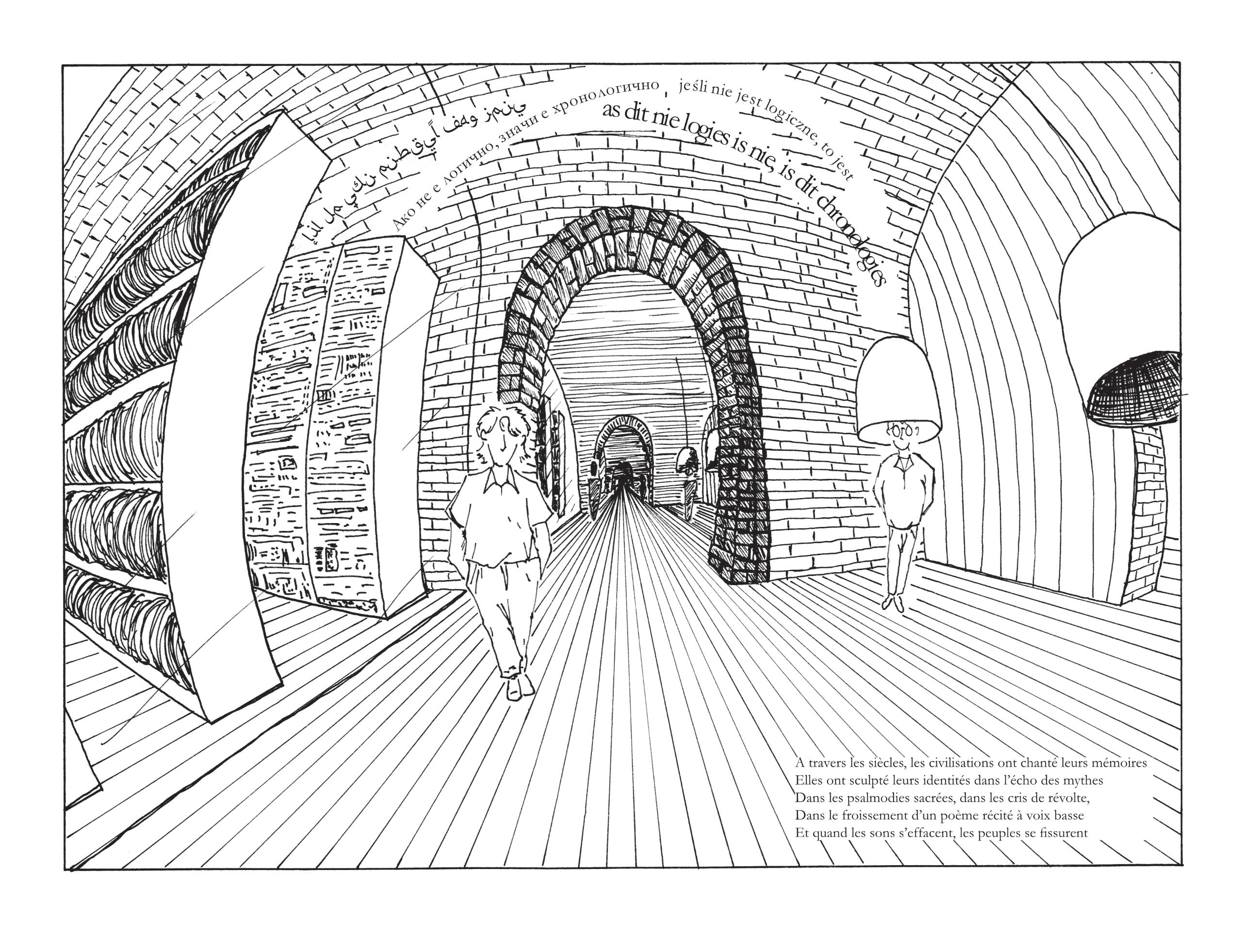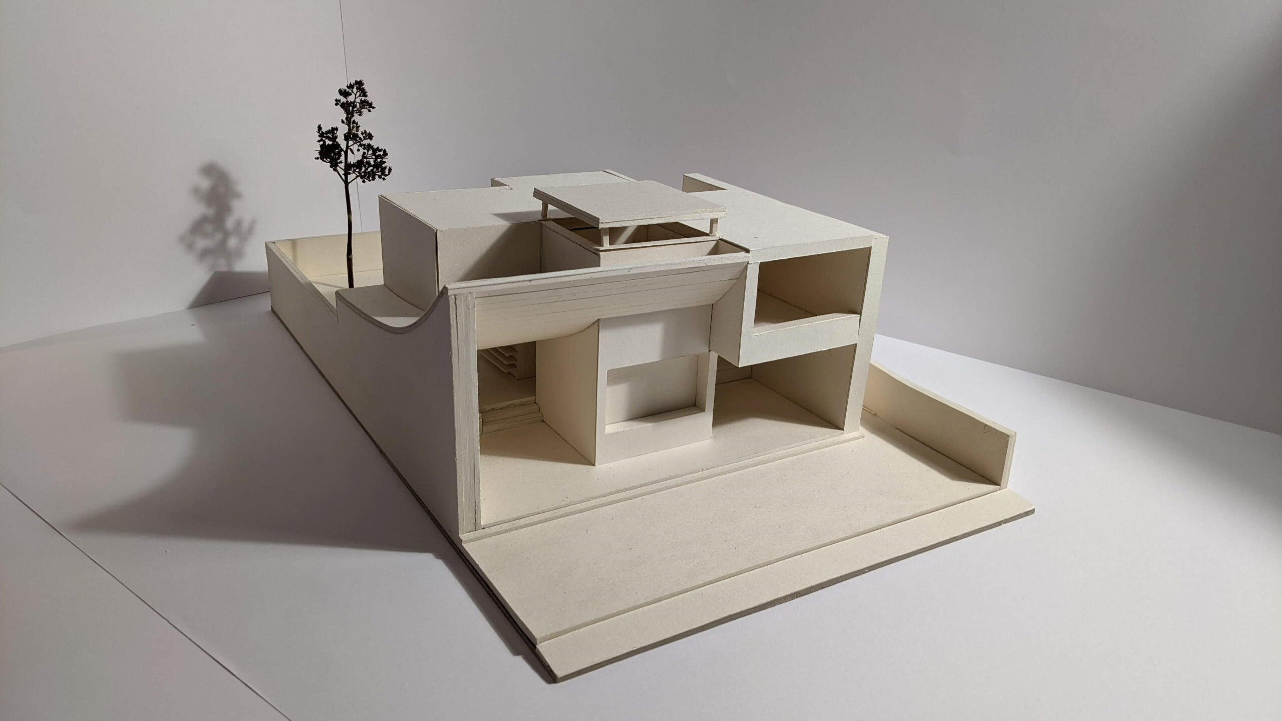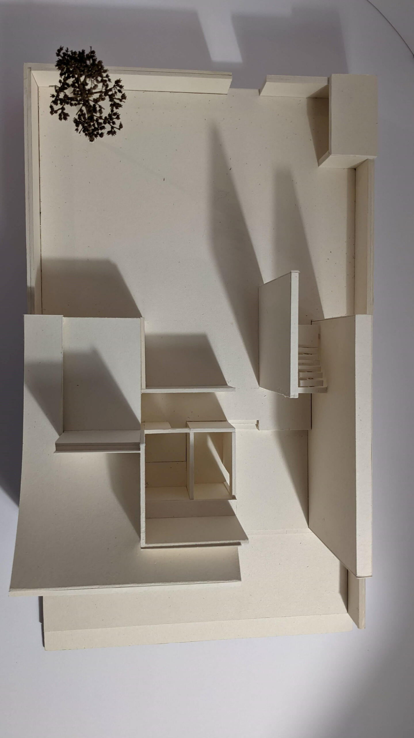 The various spaces are structured around these openings and its single source of light which allowed me to organize the spaces based on which ones need more or less light. For example, study and reading areas are in the brightest areas, with walking spaces located in intermediate light, and in the darkest areas, books, which are best preserved away from light.