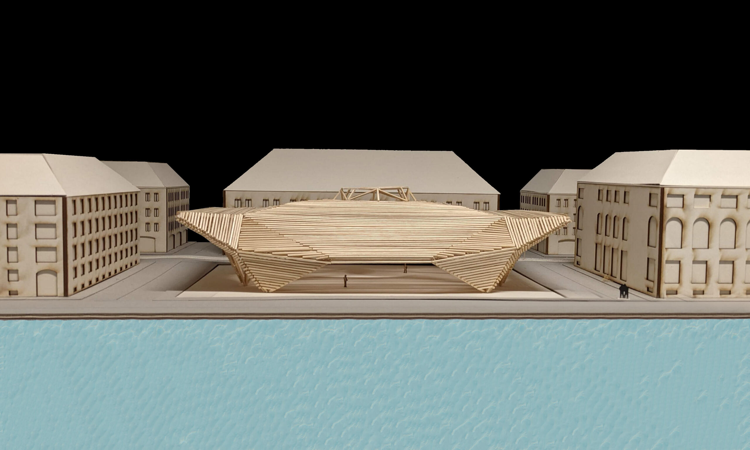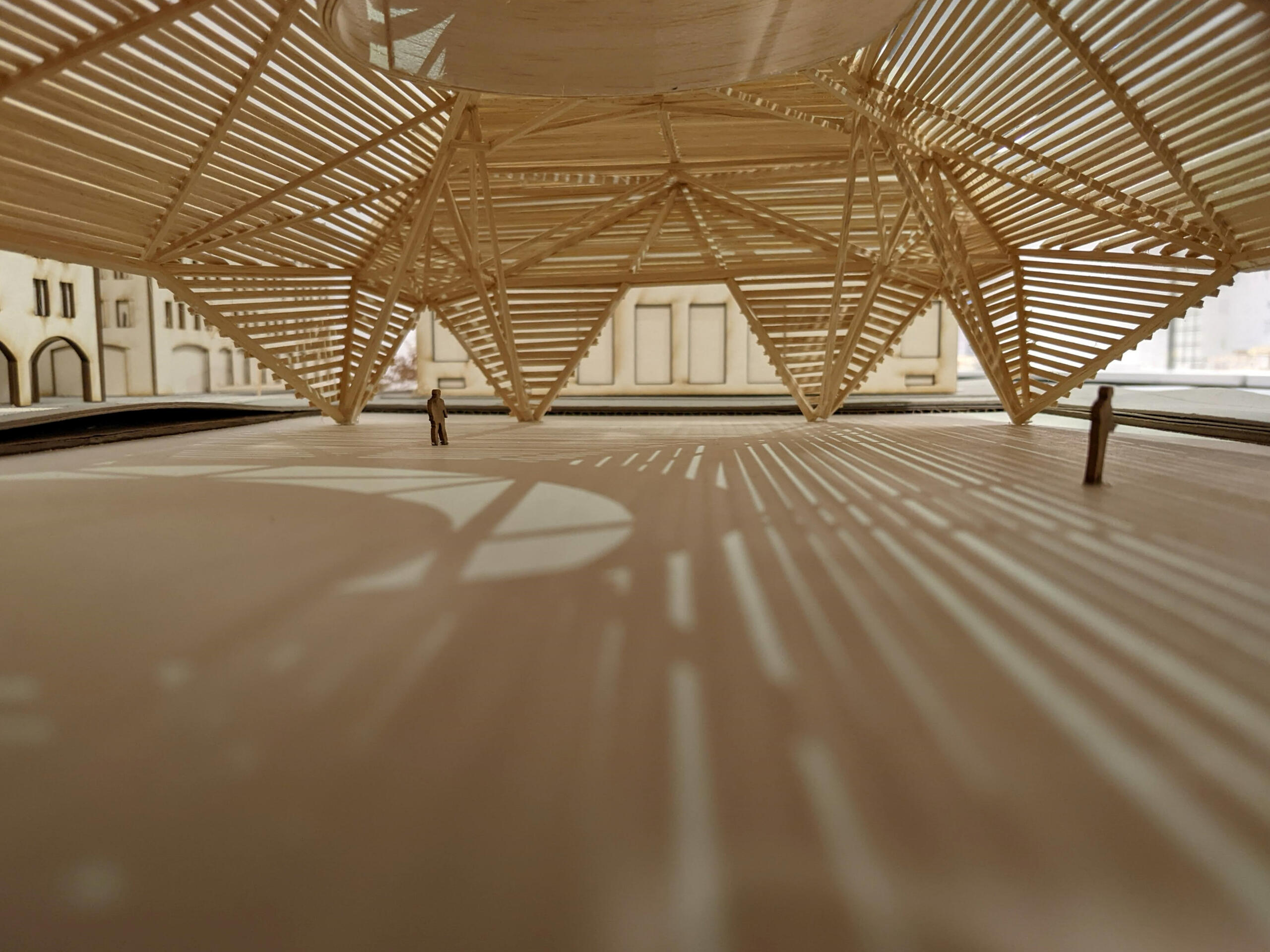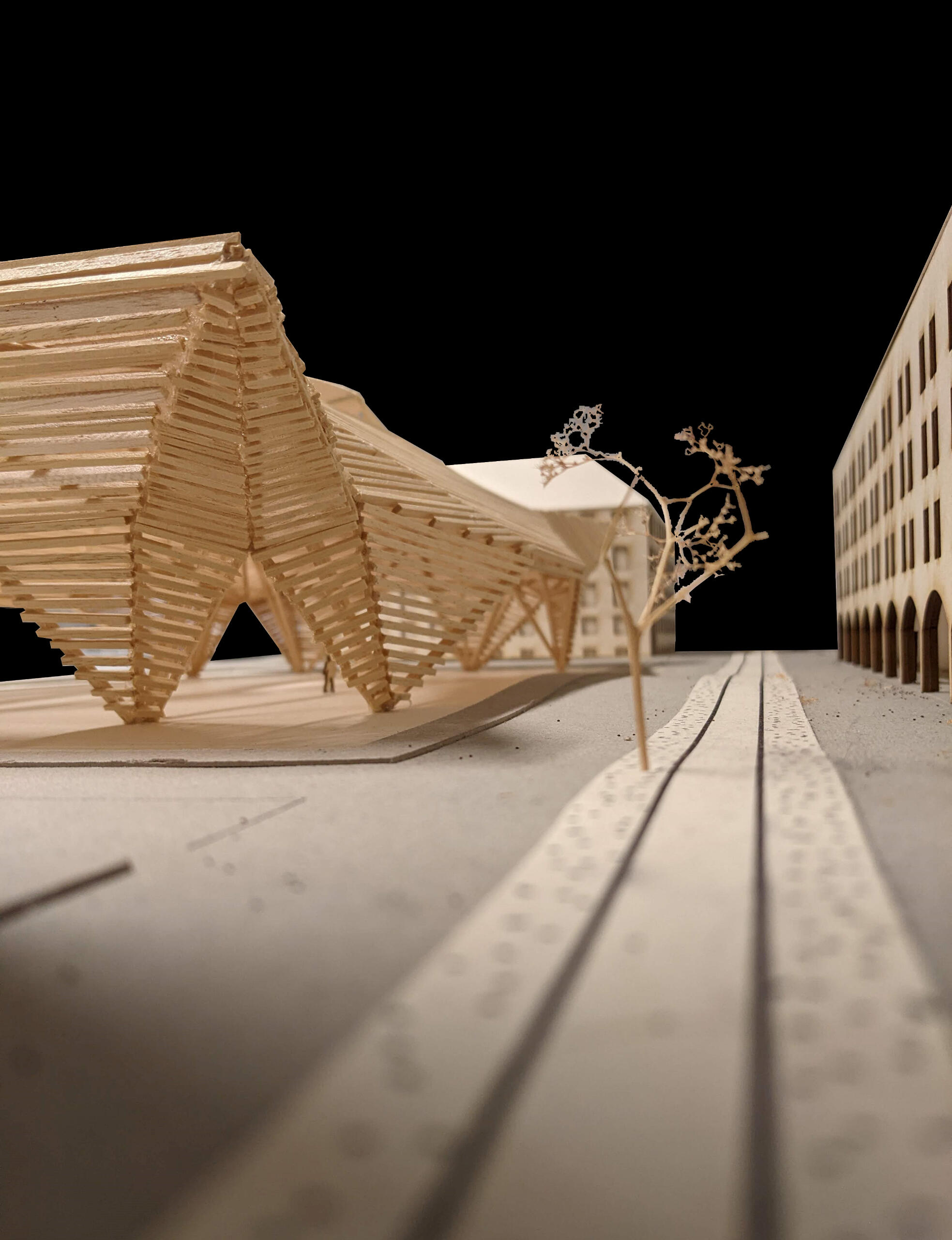 For this project we had an empty plot in a city center. The goal was to create a multipurpose space that could host markets, social gatherings, concerts ... all while taking into concideration the existing environment.I began this project by analyzing how people would move around inside the space if it were empty. Thus, I decided to open up the 4 corners of the structure to create axes of movement.