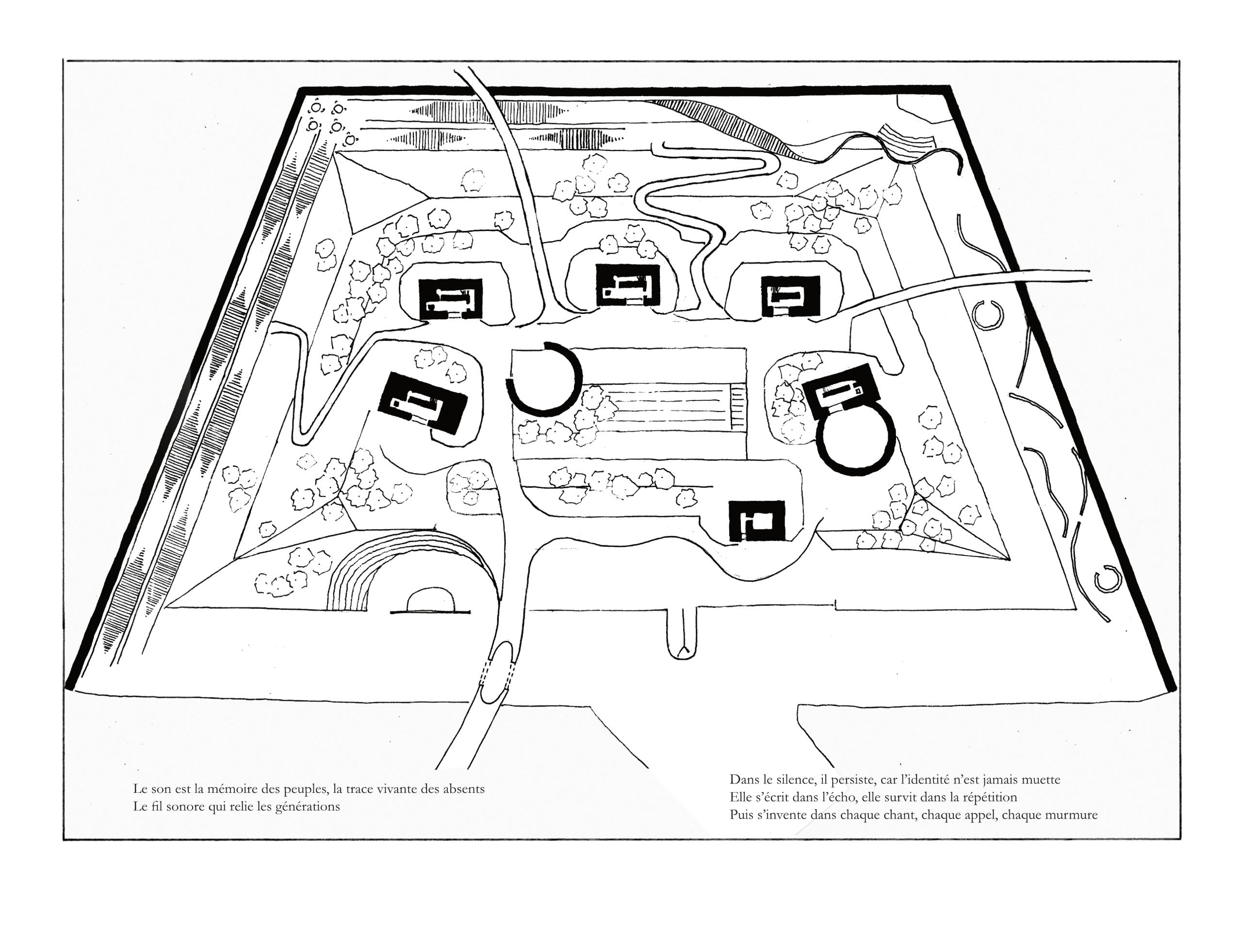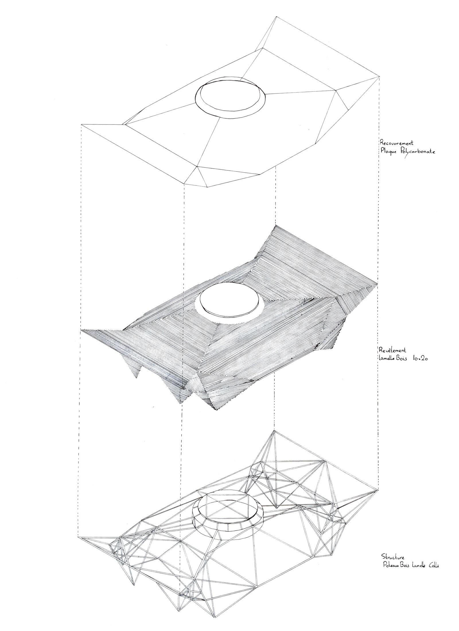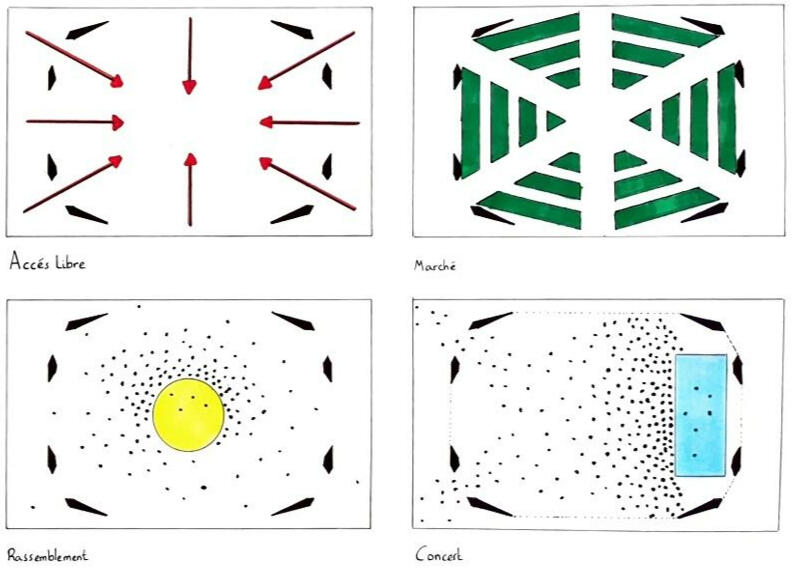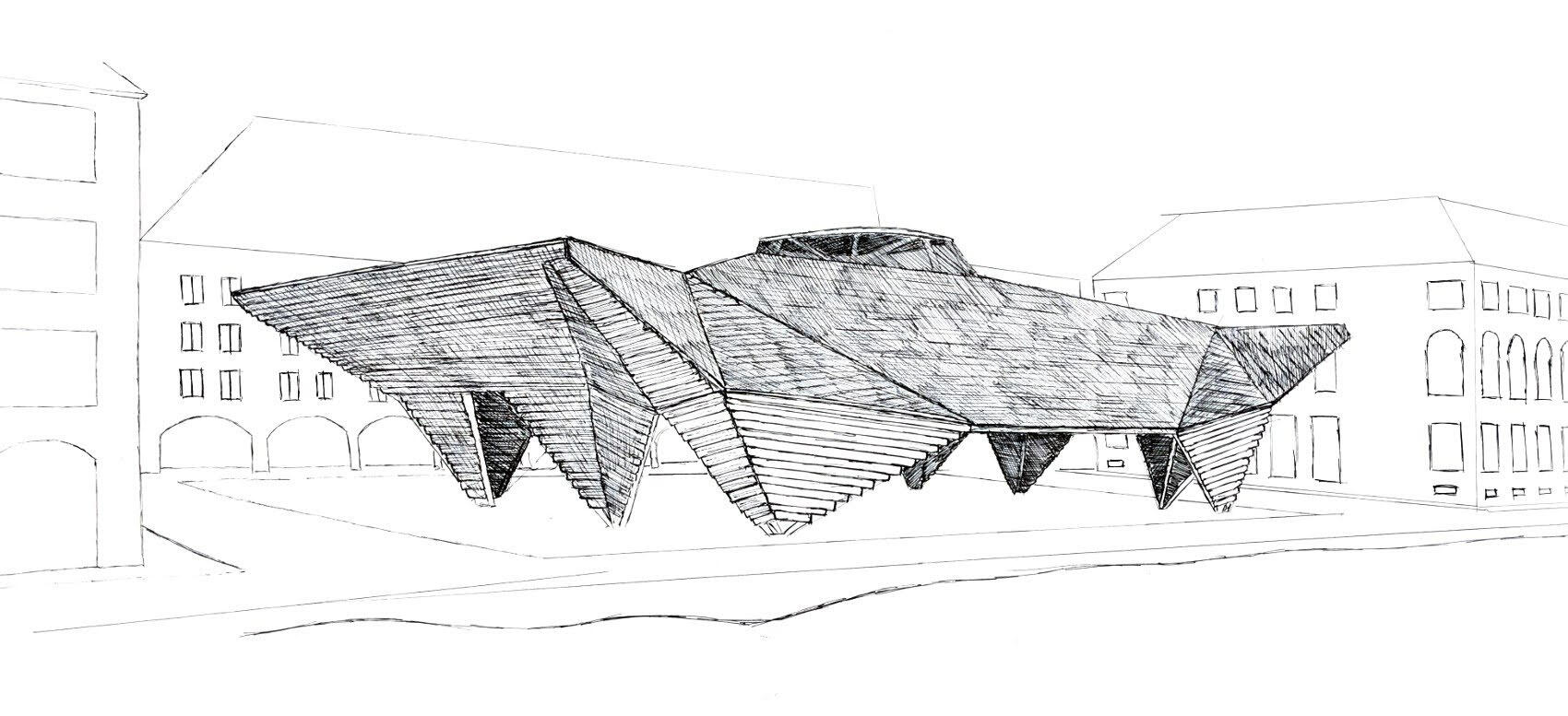 For this project we had an empty plot in a city center. The goal was to create a multipurpose space that could host markets, social gatherings, concerts ... all while taking into concideration the existing environment.I began this project by analyzing how people would move around inside the space if it were empty. Thus, I decided to open up the 4 corners of the structure to create axes of movement.