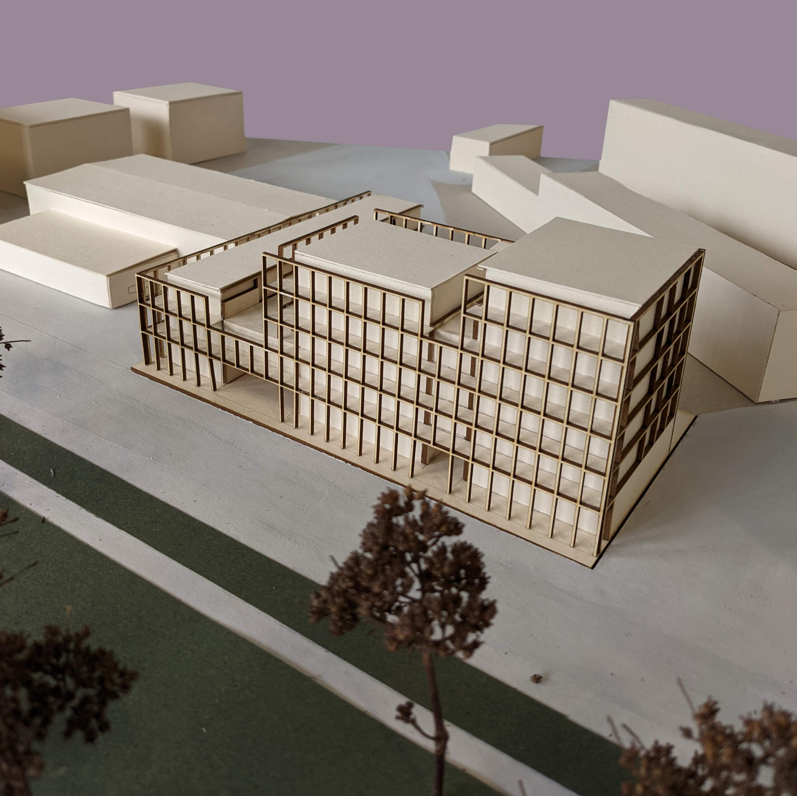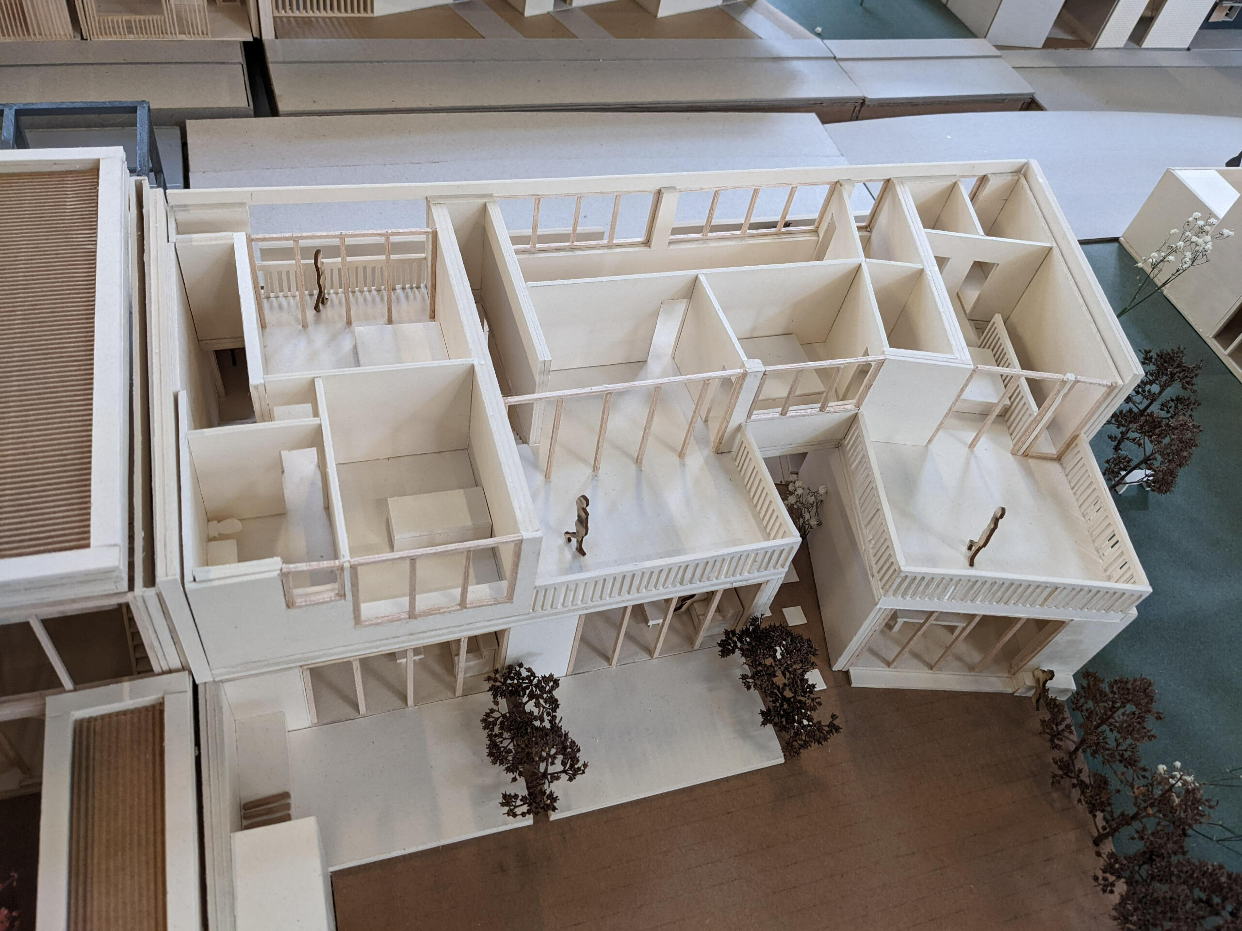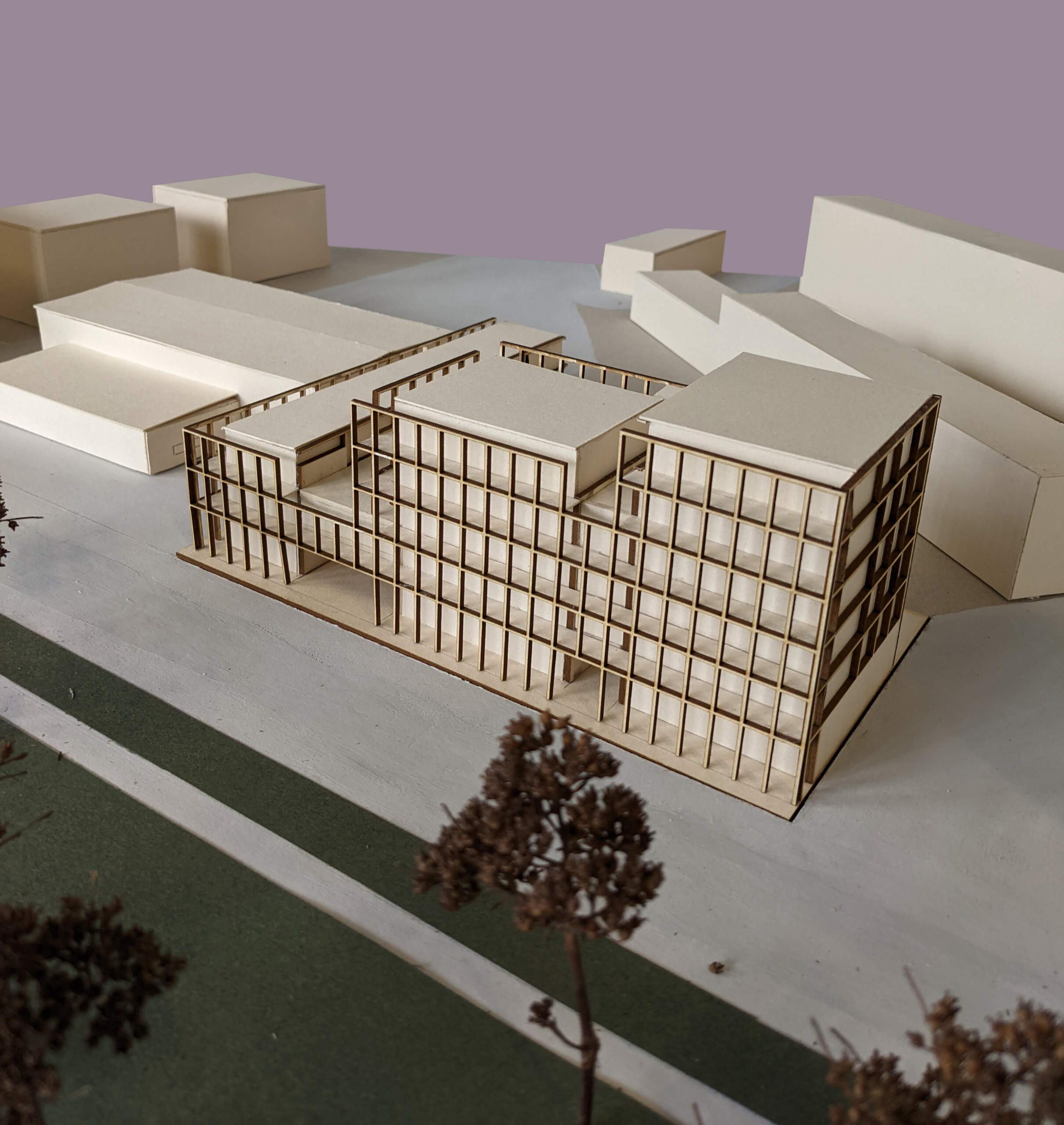 The site of this project is between a gymnasium (two storeys high) and a building (11 storeys high). My project contains 30 housing units in a variety of apartment layouts and sizes.