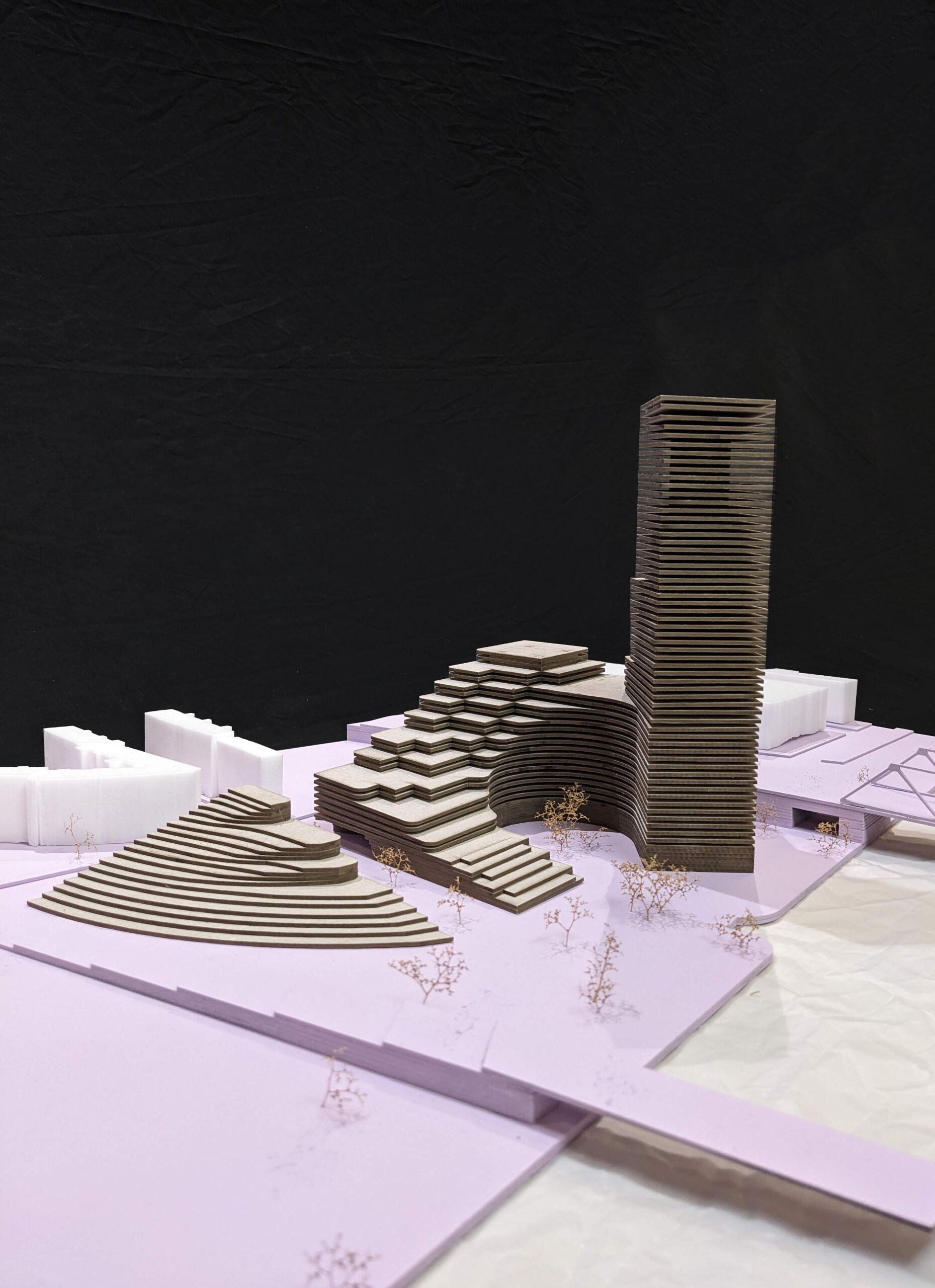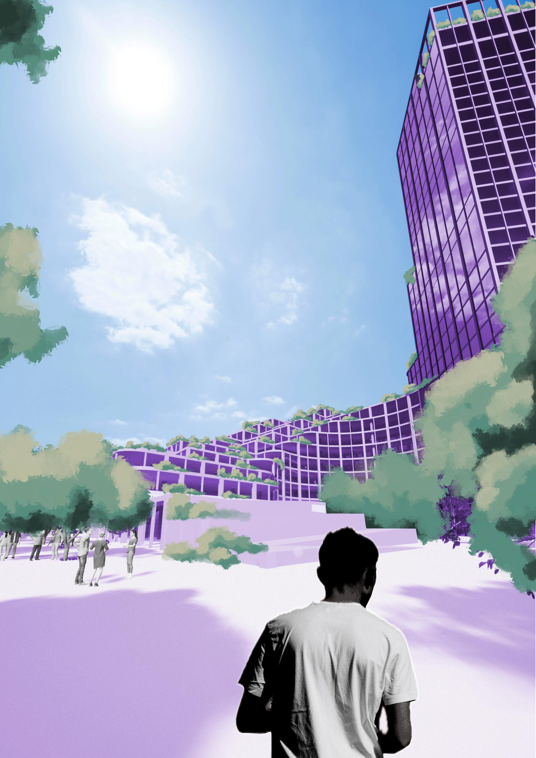 My main goal for the building was to create a fluid connection between the existing structures and the tower. Additionally, I wanted to create an extension of the public space through a succession of gardens climbing the building. The terraces are various sizes; therefore, creating different atmospheres. Smaller spaces are quieter and secluded, whereas big terraces allow for larger-scale events such as music festivals or the Oktoberfest.