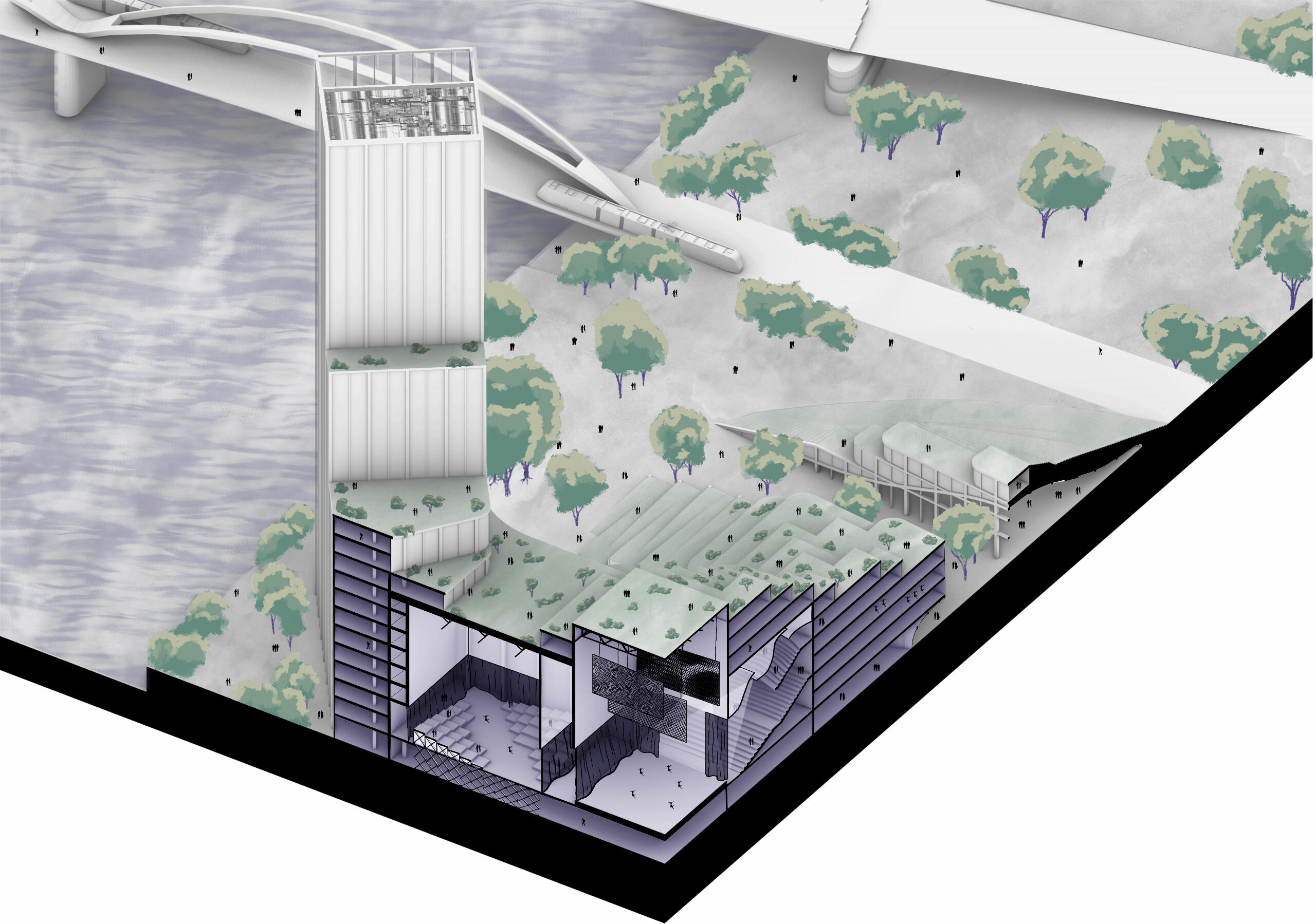The building is designed to accommodate seven different architectural programs, with the principal one being two performance halls. This program is composed of one classical Italian room for highly sound focused performances such as music, choir or operas. The second room is an experimental hall for performances such as dance and theater. This experimental hall has a grid of mobile platforms on the floor that create a completely modular space. Additionally, these two performance halls can be merged thus allowing for a second audience to view the stage from another angle.