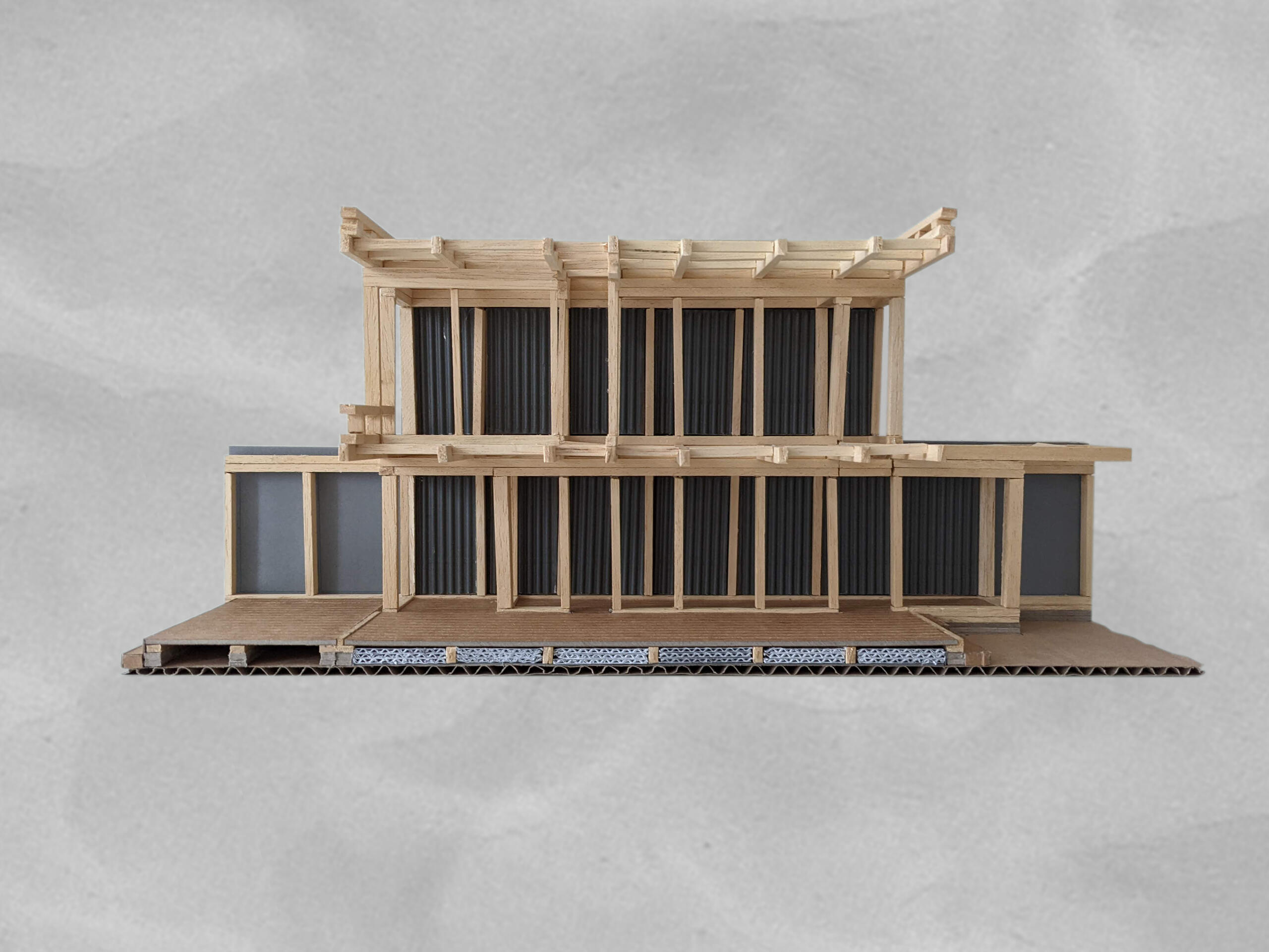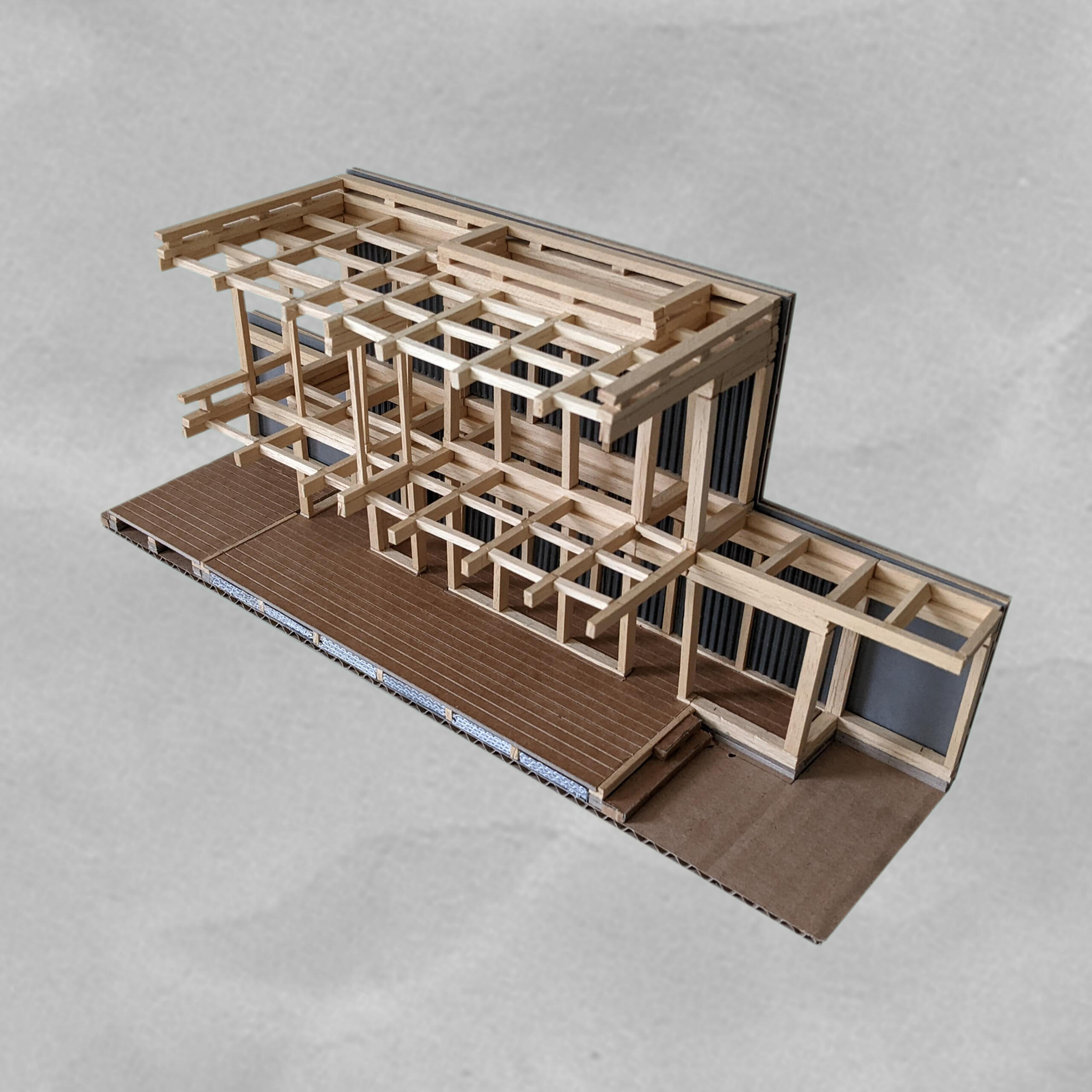 For the rest of the space, I drew inspiration from the structure of Studio Lada’s multi-purpose hall, which uses triangulated wooden beams to create a long span. I adapted this structure to open up the corners and maintain a central void. This structure is covered with wooden slats to control the flow of light, which is initially shaded and becomes less and less obstructed in the center, reminiscent of tree shadows.
