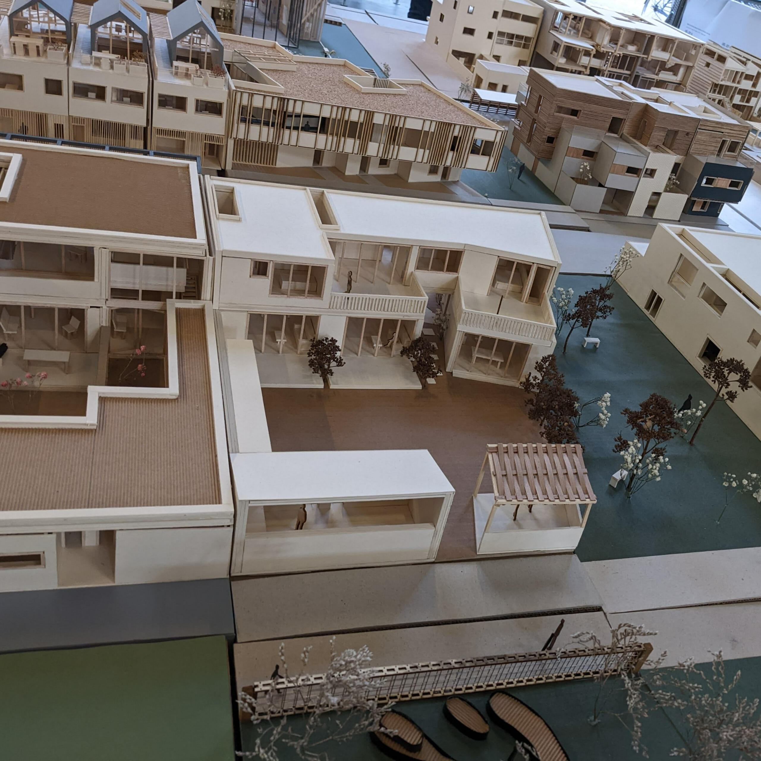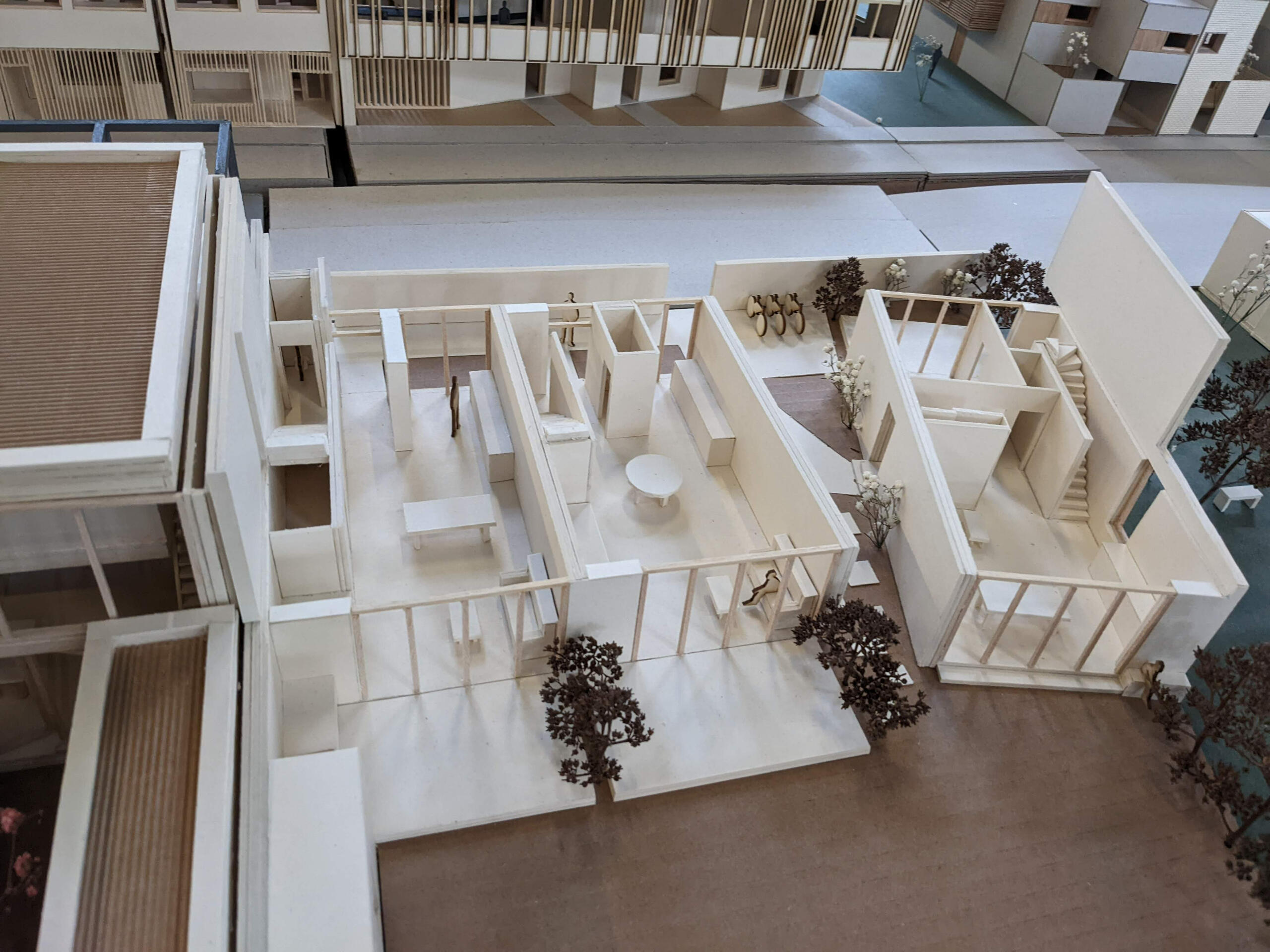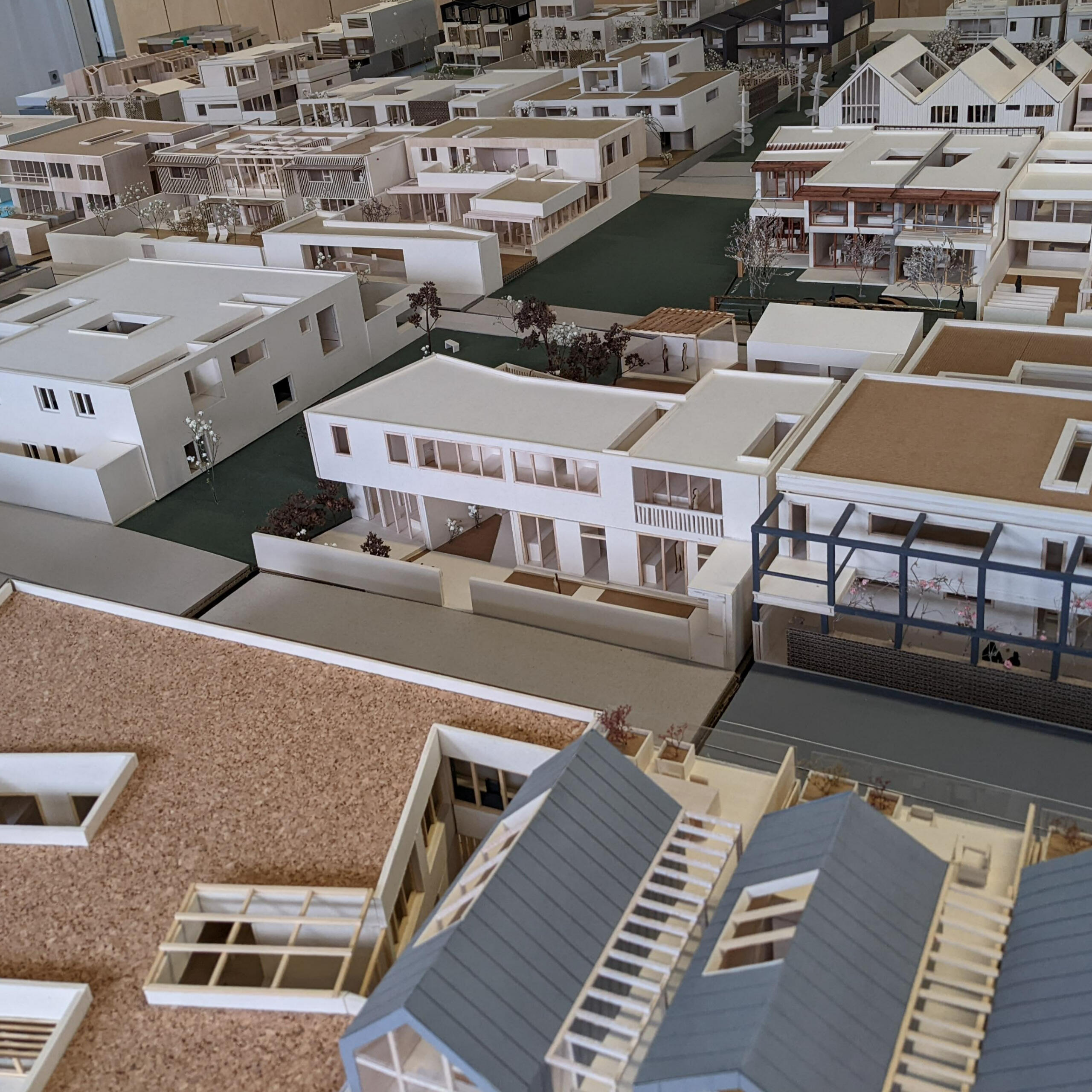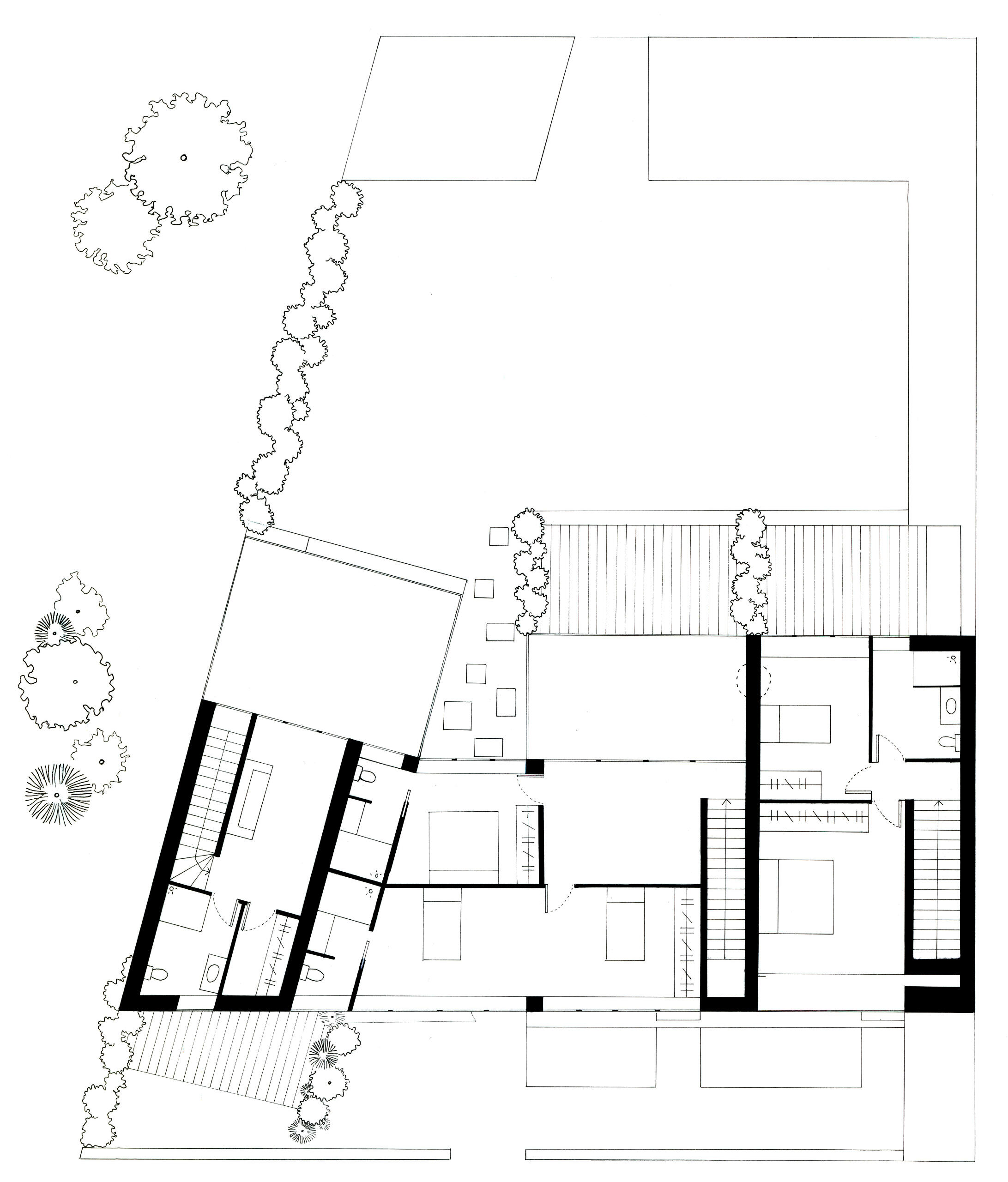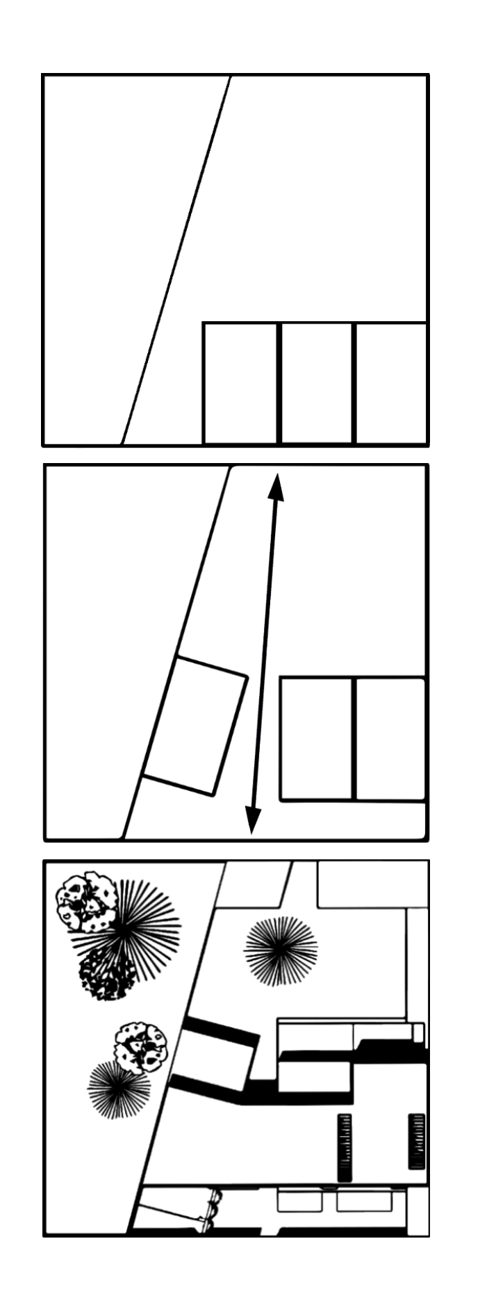Two of the three homes are for families with young children. The third is for an elderly couple.We decided to use the slanted edge of the plot to create a calm space for the seniors, protecting them from the dynamic lifestyle of the other two families. By separating the seniors, they can enjoy a quiet, private garden terrace, while living in the same area as the other two families, who benefit from the large communal garden where children can play together.
