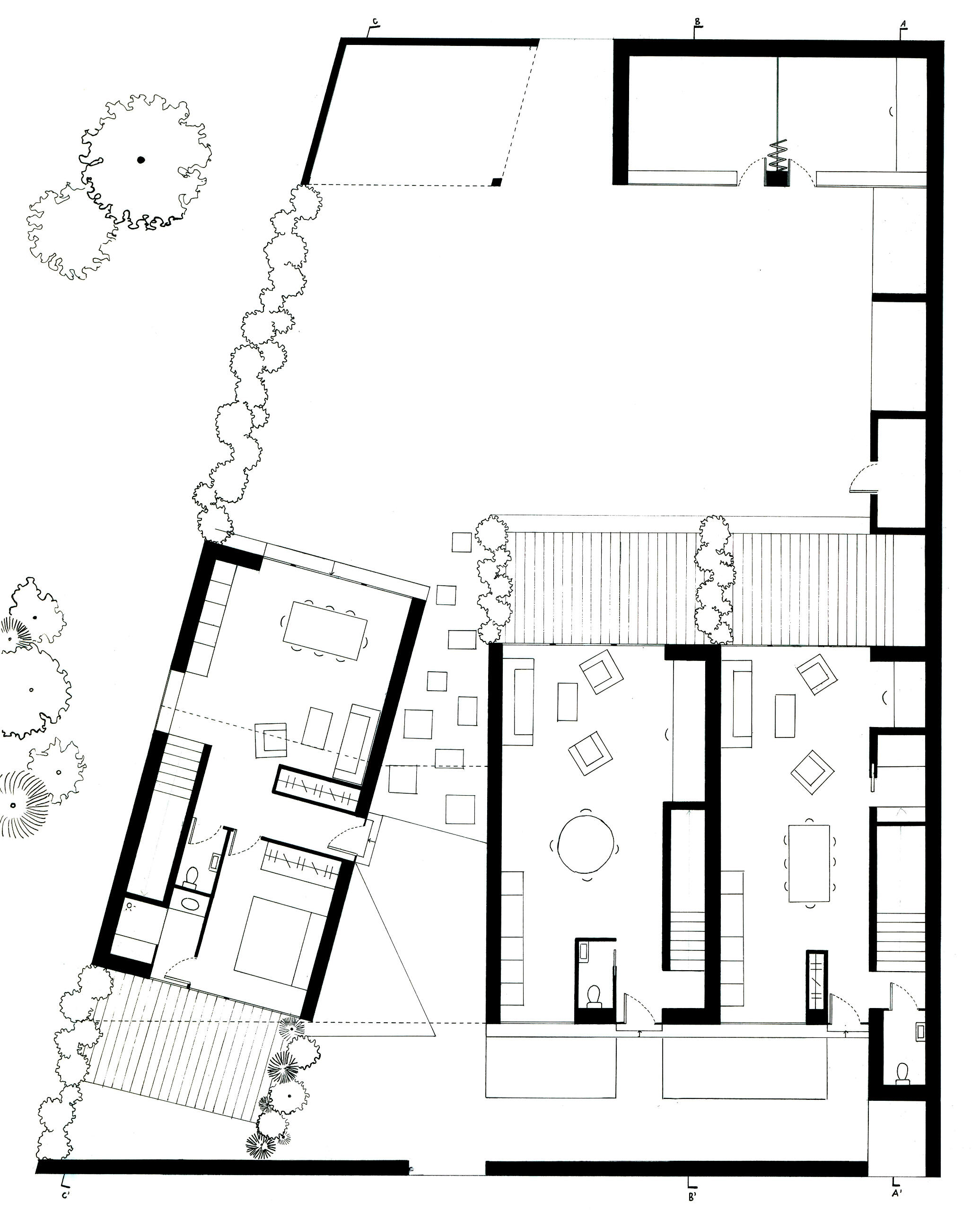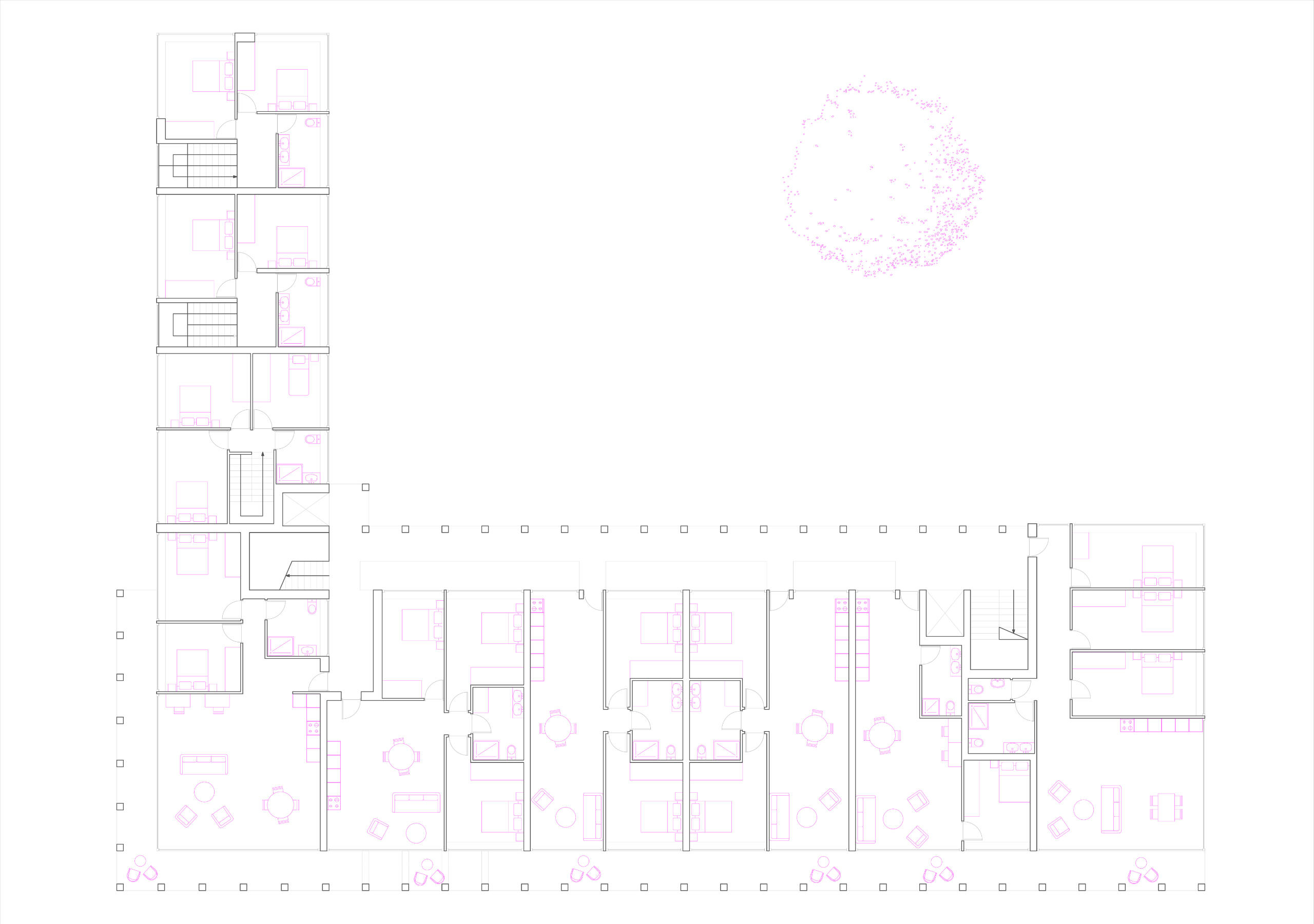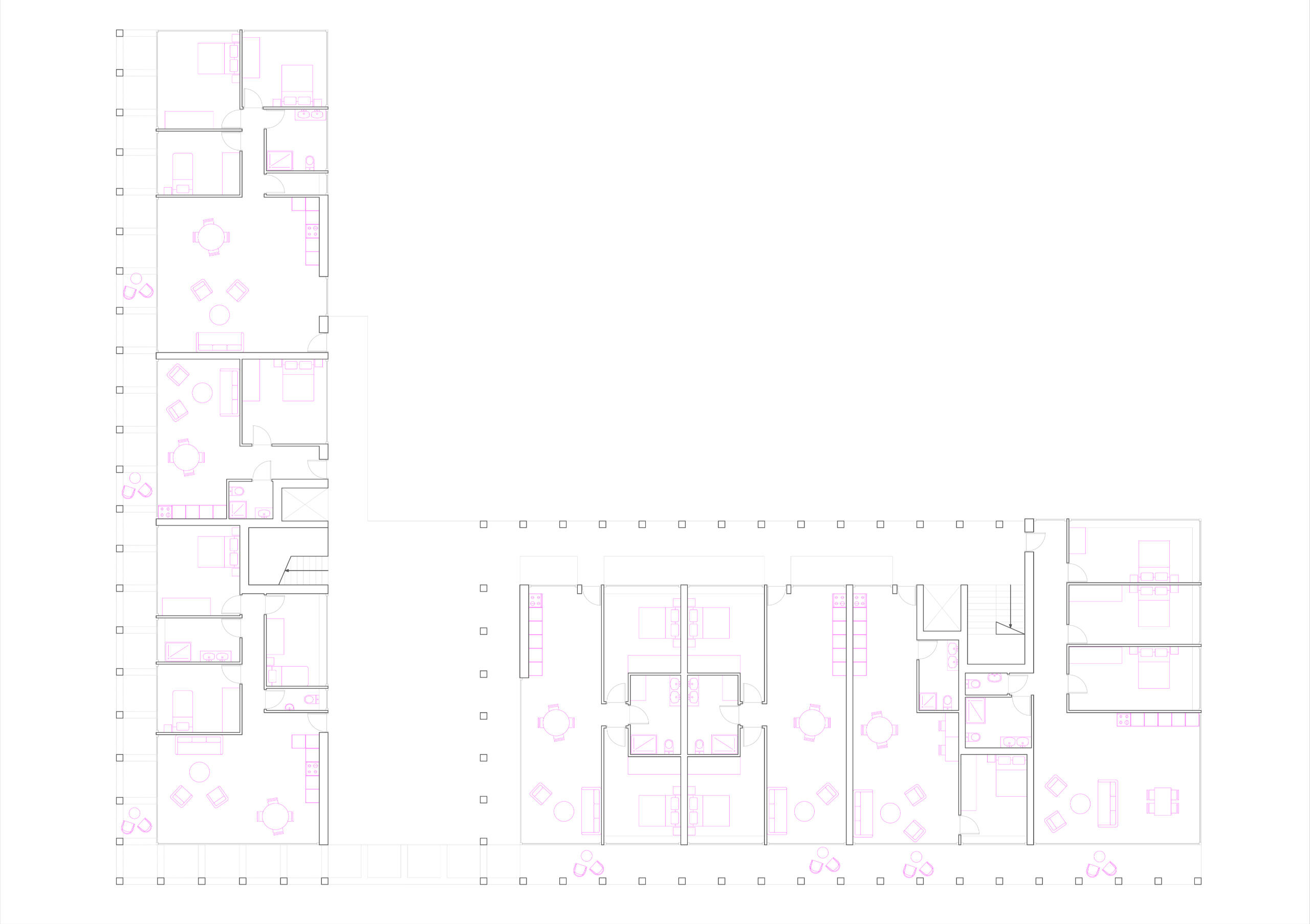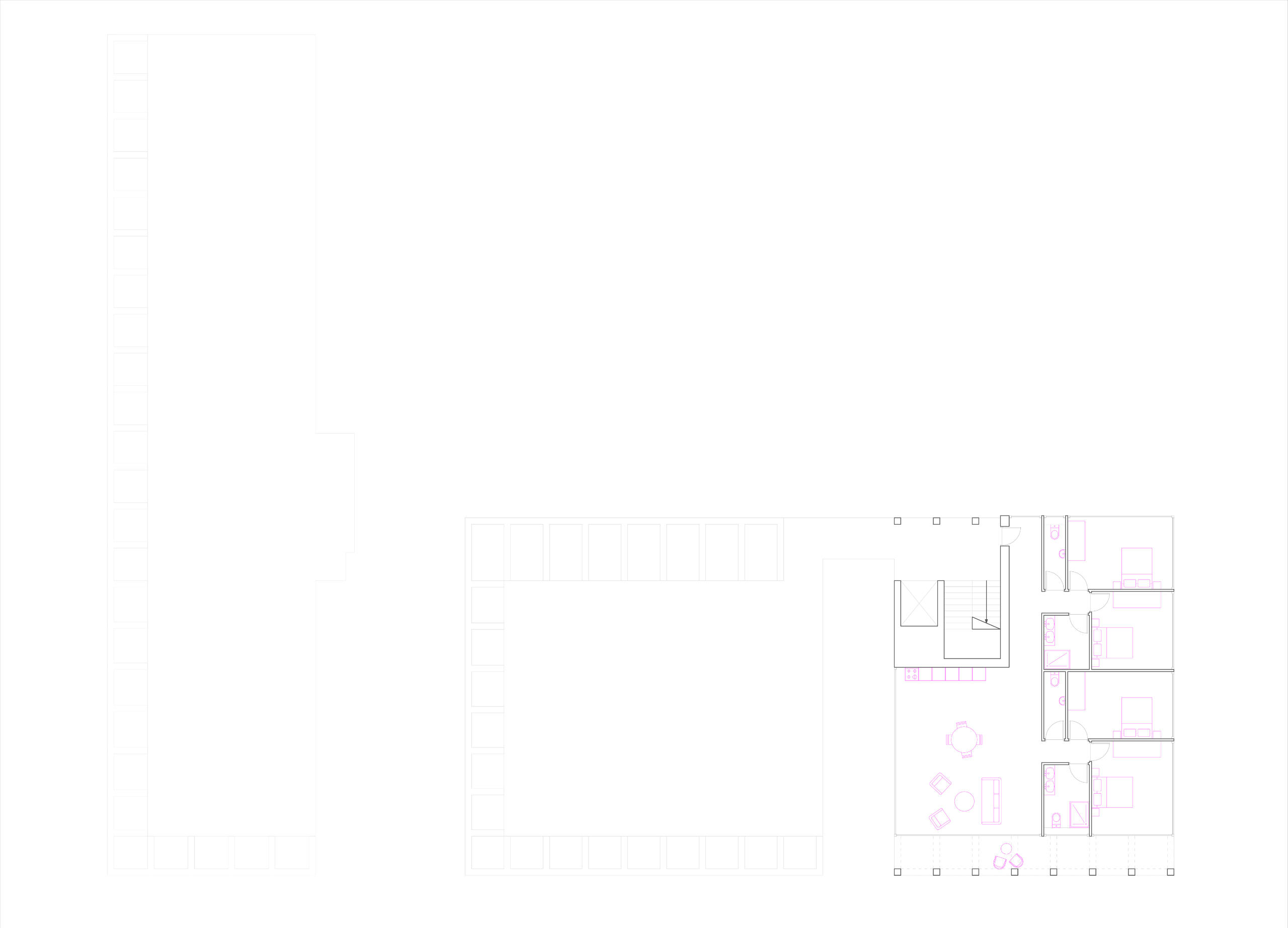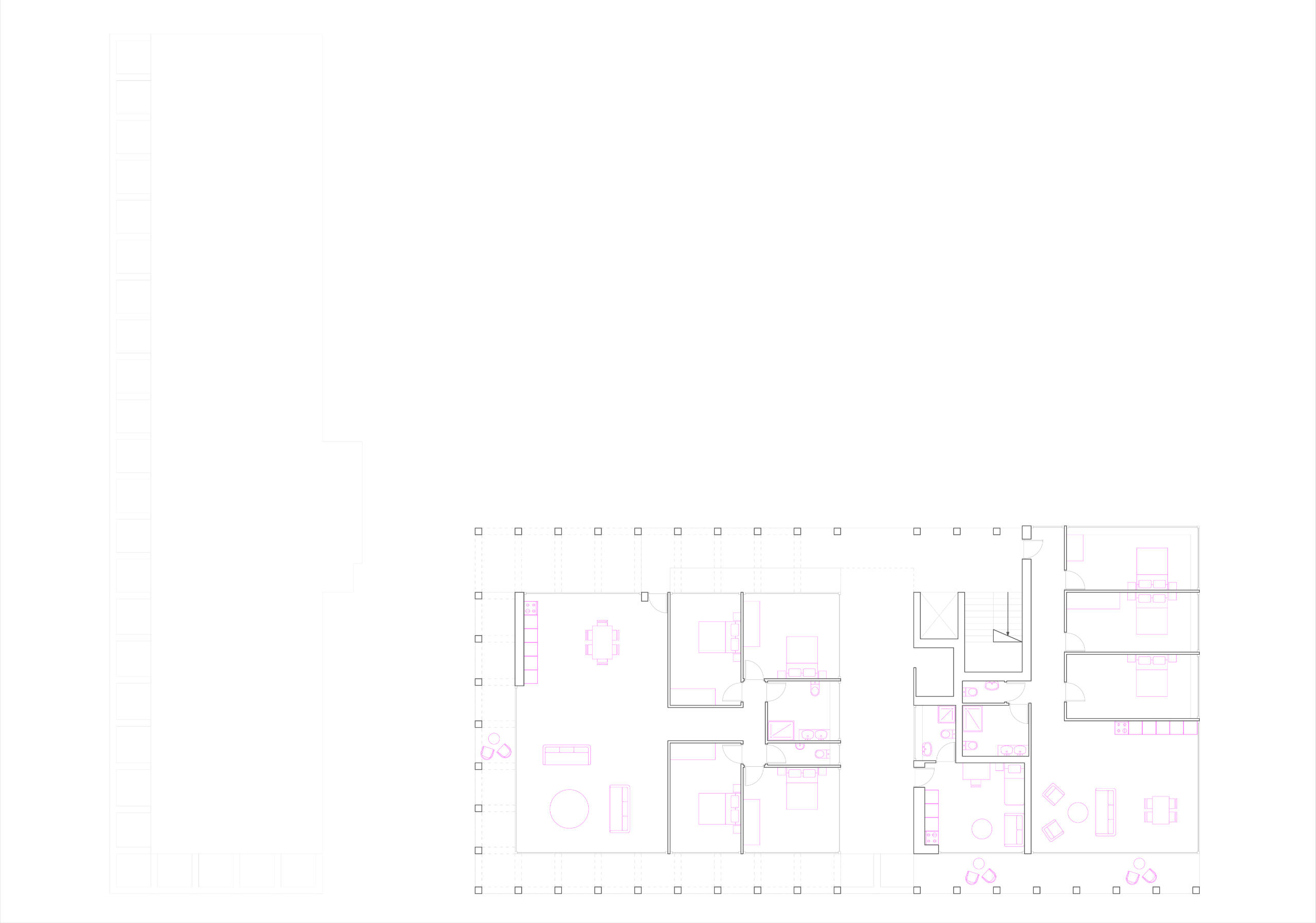 Finally, by separating the seniors’ apartment, a transversal opening is created in the center of the building. This new axis creates a very fluid distribution within the plot, allowing each family to have access to the shared spaces while at the same time having private access to their own individual dwellings.