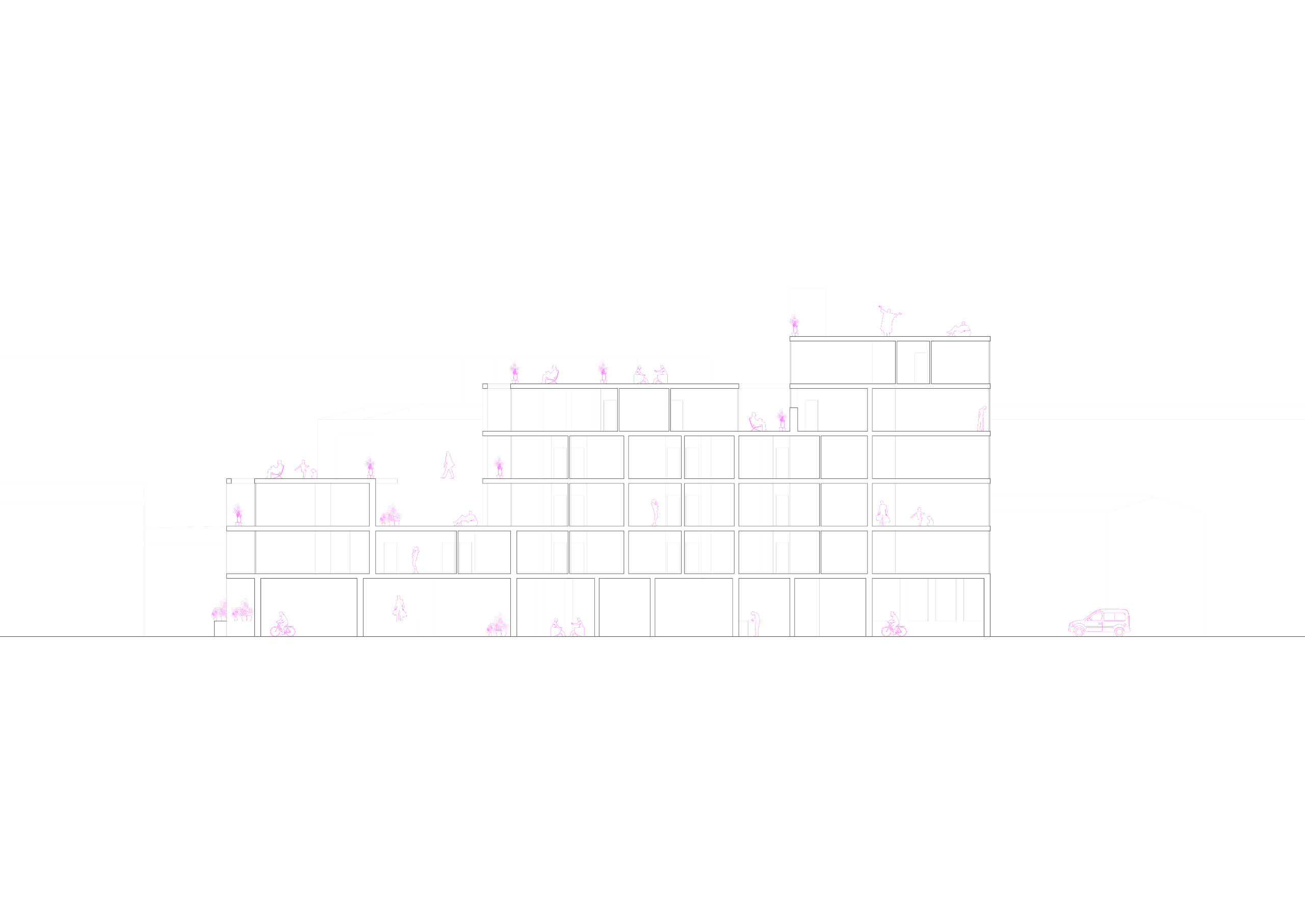 The building’s stair shape creates a smooth transition between the low gymnasium (on the left) and the tall building (on the right), while also offering several outdoor spaces for residents. As exposure to the outdoors is essential for comfortable living, each unit has its own private balcony, in addition to an access to bigger, shared terraces. Each of these terraces offers a different atmosphere and view.